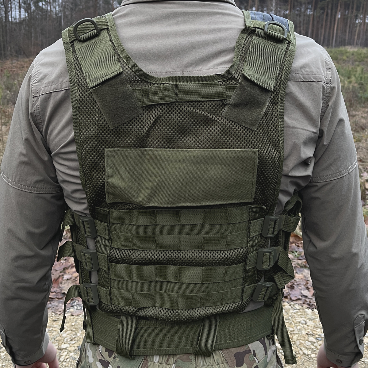 - Kieszeń na plecach zamykana na rzep z karabińczykami do zamocowania panelu balistycznego/ochronnego