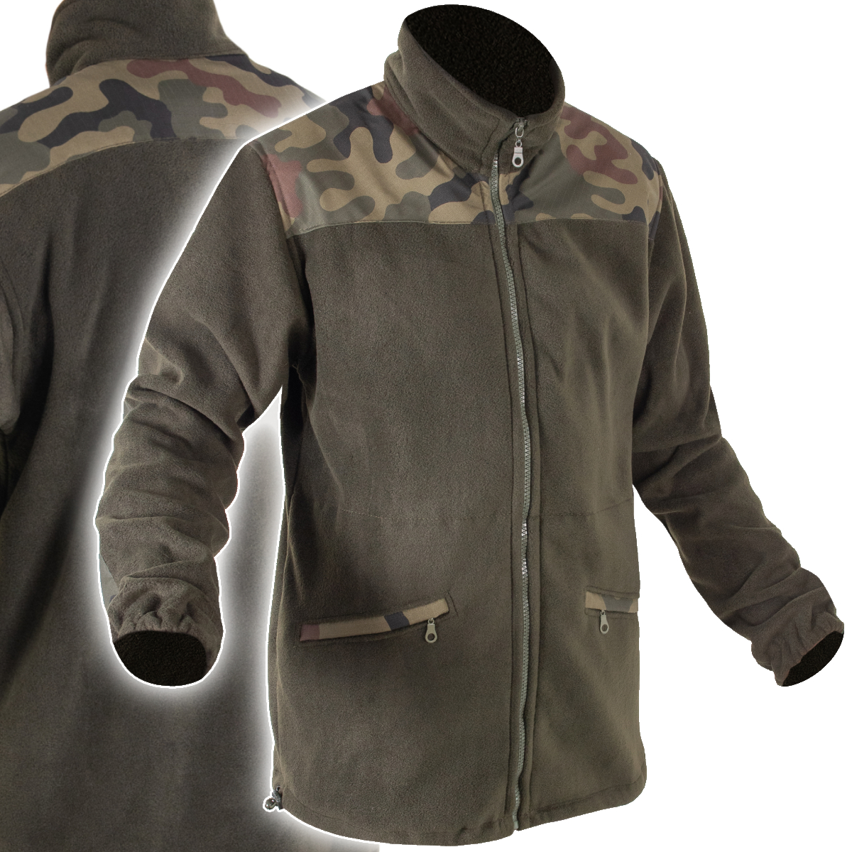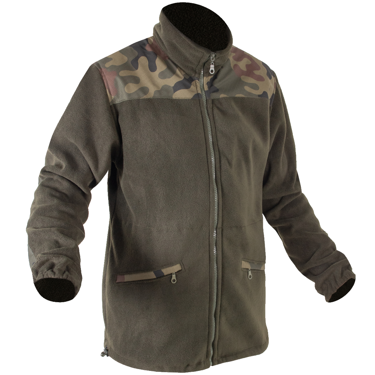 Bluza polarowa w kolorze zielonym. Posiada dwie kieszenie zasuwane na suwak, ściągacze u dołu po obu stronach oraz rękawy zakończone również ściągaczem. W górnej części posiada wysoki kołnierz chroniący szyję przed nieprzyjaznymi warunkami atmosferycznymi.